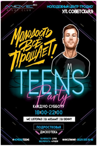 Teenager’s disco from 18.00 to 21.00. Cost tickets – 4 rubles
