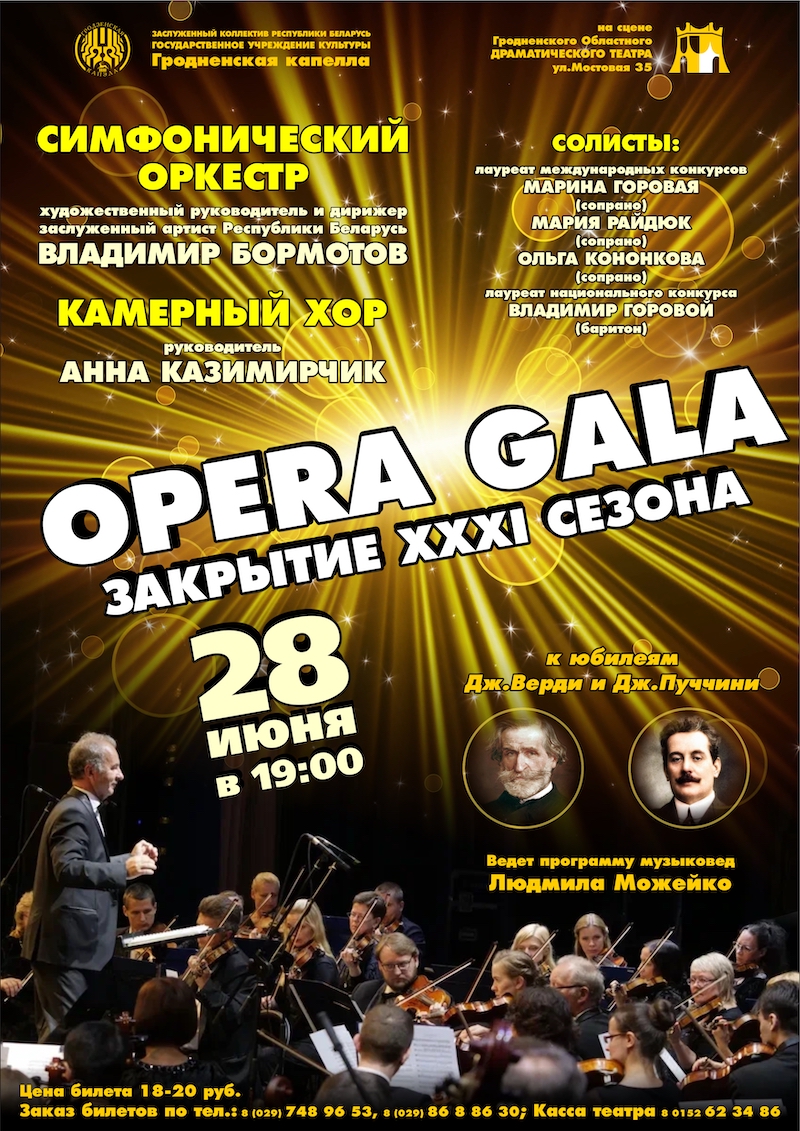 Симфонический оркестр, камерный хор и солисты Гродненской капеллы приглашают на концертную программу "OPERA GALA", посвященную юбилеям выдающихся итальянских композиторов Дж.Верди и Дж.Пуччини.