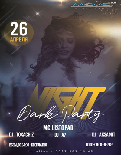 Night club "Movie 60" in the Youth centre “Grodno”. Two-level recreation area, bar "Graffiti", DJ Deadtrees, DJ Toxachiz, MC Listopad, go-go, dance show, photo zone, contests and gifts. Wi-Fi. Face Control & Dress Code.